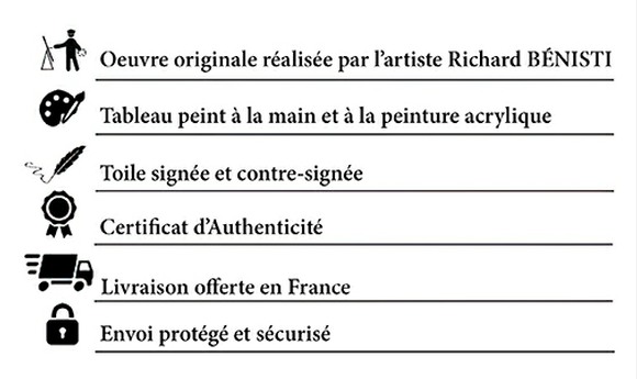 Toutes les oeuvres abstraites possèdent un système d'accrochage, vous permettant de profiter immédiatement de l'œuvre d'art sur votre mur. Chaque tableau moderne est protégé par trois couches de vernis afin de donner une très bonne longévité à celui-ci. Les bords du tableau sont également peints en noir pour un rendu esthétique.