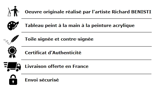 La toile est signée, contre-signée et aura à son verso les références de l’artiste, accompagné de son Certificat d’Authenticité