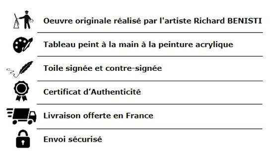 La toile est signée, contre-signée et aura à son verso les références de l’artiste, accompagné de son Certificat d’Authenticité
